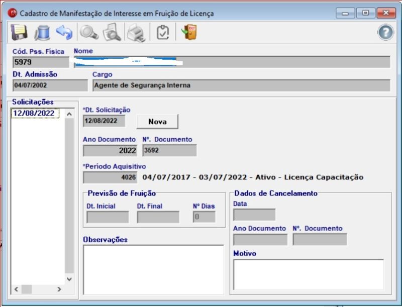 - Cadastro de Solicitação de Fruição de Licenças (novo)