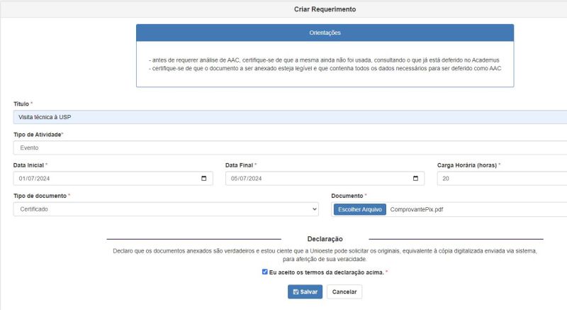 - Um requerimento comporta o registro de apenas uma AAC; se tiver mais de uma atividade, deve-se fazer mais de um requerimento