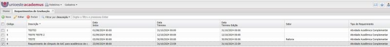 • no módulo web do Academus, acessar o menu Cadastros e clicar no item Requerimentos de Graduação