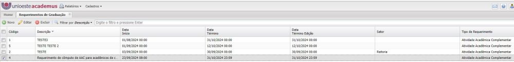 • O cadastro de Configuração de Cronograma de Requerimento permite gerenciar os períodos em que os acadêmicos poderão realizar requerimentos de registro de Atividade Acadêmica Complementar (AAC) e definir quais acadêmicos estão aptos a participar do processo