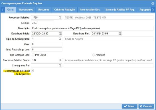 - Confirmação de Envio de Arquivos: se ativo, indica que o candidato, que está fazendo a inscrição, precisará finalizar o envio de arquivos, ou seja, informar que terminou o upload de arquivos do referido Cronograma e que não poderá mais fazer edição; Desta forma, a banca de avaliação já pode Analisar os Arquivos, mesmo que o período de inscrições esteja em andamento