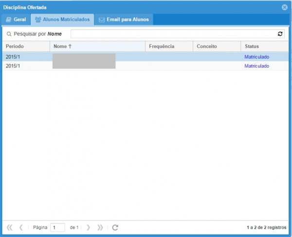 Ao selecionar a aba “Alunos Matriculados” que aparece ao lado da aba “Geral” (Figura 2), se apresentam todos os alunos matriculados na disciplina (Figura 3).