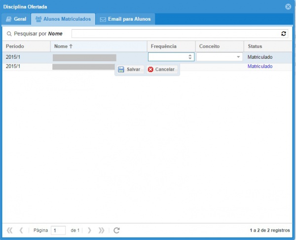 Ao clicar 2 vezes sobre um aluno, o sistema habilita os campos Frequência e Conceito para o lançamento. Os valores inseridos podem ser confirmados, clicando o botão “Salvar”, ou descartados, clicando o botão “Cancelar” (Figura 3a).