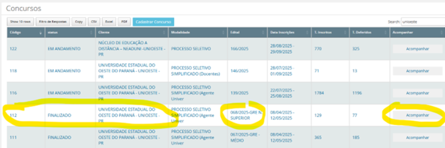 1.3)  Na listagem de processos seletivos da Unioeste, localize o processo desejado e clique no botão Acompanhar, do lado direito da tela: