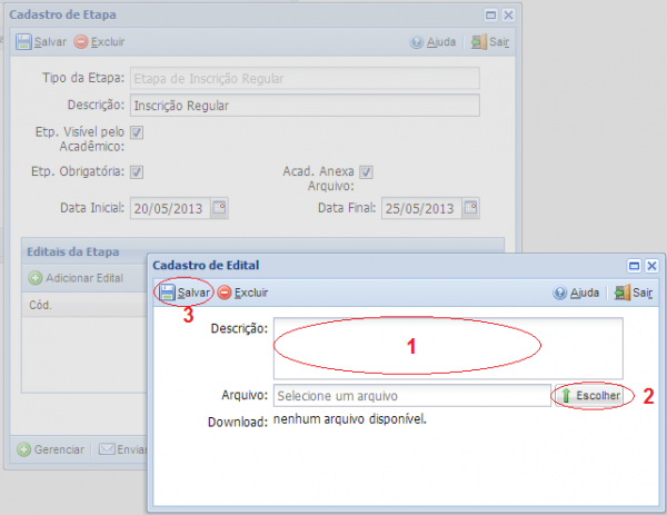 A Figura 4 ilustra como adicionar um Edital(Arquivo). Depois de clicar no botão do item 6 da Figura 3,