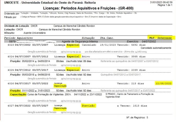 - Licença Especial/Capacitação: foram gerados apenas períodos aquisitivos quinquênios (5 anos) e vinculados às fruições de licenças especiais/capacitação com até 95 dias, caso existissem
