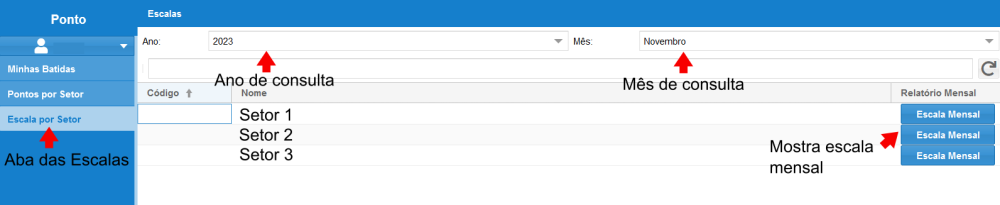 O intuito dessa funcionalidade é verificar as escalas dos funcionários do setor desejado. Caso o setor de trabalho tenha filhos, é possível visualizar os setores filhos separadamente, assim como no setor pai aparecerão os funcionários dos setores filhos. Semelhante às outras abas, é necessário informar o mês e ano da requisição. É possível consultar o setor desejado pelo código do setor e por sua descrição. Cada linha contém o setor e o botão para exibição da escala referente ao mês selecionado.