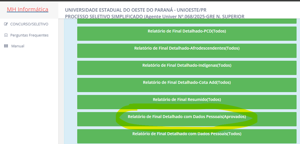 1.6) Na tela seguinte, role para baixo e localize o relatório Relatório de Final Detalhado com Dados Pessoais (Aprovados), e clique sobre ele: