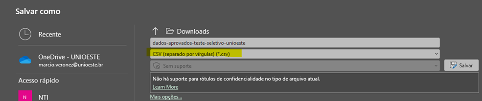 1.11) Na próxima tela, selecione o local do computador onde deseja salvar o arquivo e escolha o tipo de arquivo CSV: