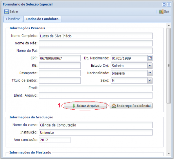1: Botão que faz o download da documentação enviada pelo candidato.