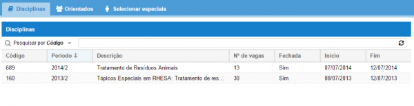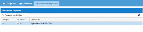 1: Ao abrir a aba Selecionar Especiais (Figura 9), são listadas as disciplinas ofertadas para aluno especial que contém alunos inscritos e que o período de avaliação da seleção esteja vigente.