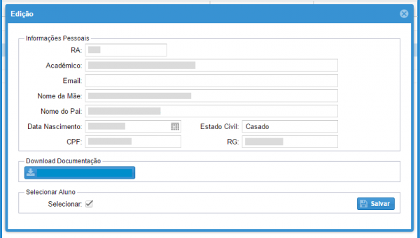 5: Na seção "Download Documentação" há um botão para baixar os arquivos que o aluno submeteu no ato da inscrição.