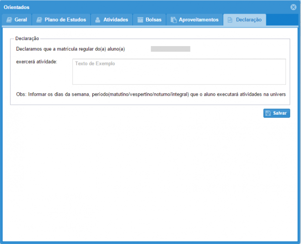 7: Na aba Declaração o docente deve especificar o período e horário semanal em que o aluno estará em atividades na universidade. Essa informações constará na declaração de matrícula do aluno.