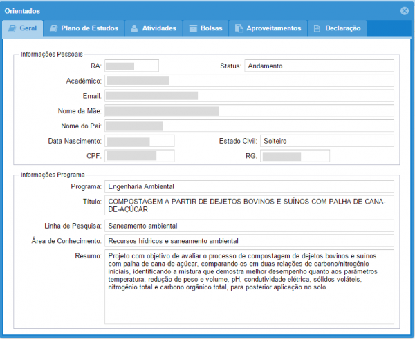 2: Ao clicar em um orientando (Figura 4), abre-se informações pessoais e do curso.
