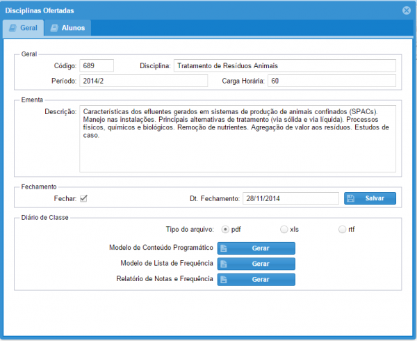 4: Logo abaixo na seção "Diário de classe" existem 3 botões onde é possível gerar o modelo de conteúdo programático, modelo de lista de frequência e relatório de notas e frequência. Cada um dos itens pode ser gerado em PDF, XLS(Excel) e RTF(Word).