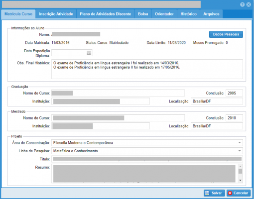 No Menu: "Matrícula Curso", Altere os campos "Linha de Pesquisa" e "Título", conforme desejar. (figura 1).